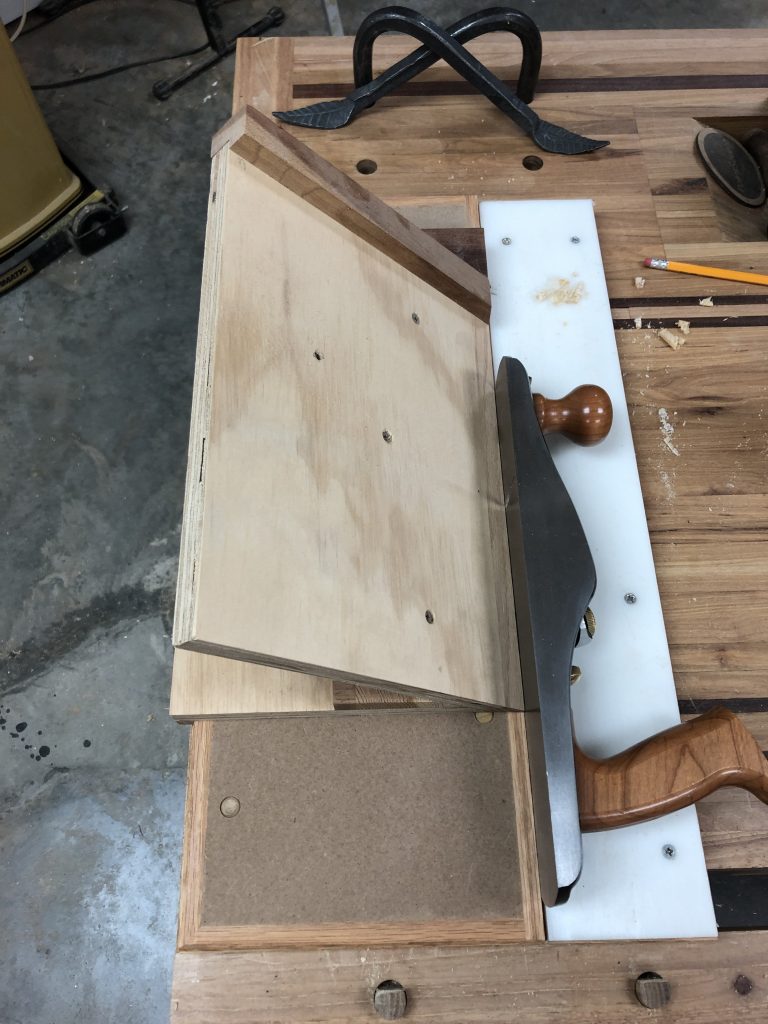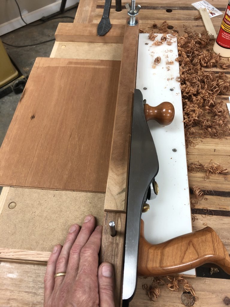 I made this top to hold a couple of thin pieces in place while you plane the adjoining edges. In this case I’m shooting two pieces of veneer that will be abutted. Once glued the seam is invisible.